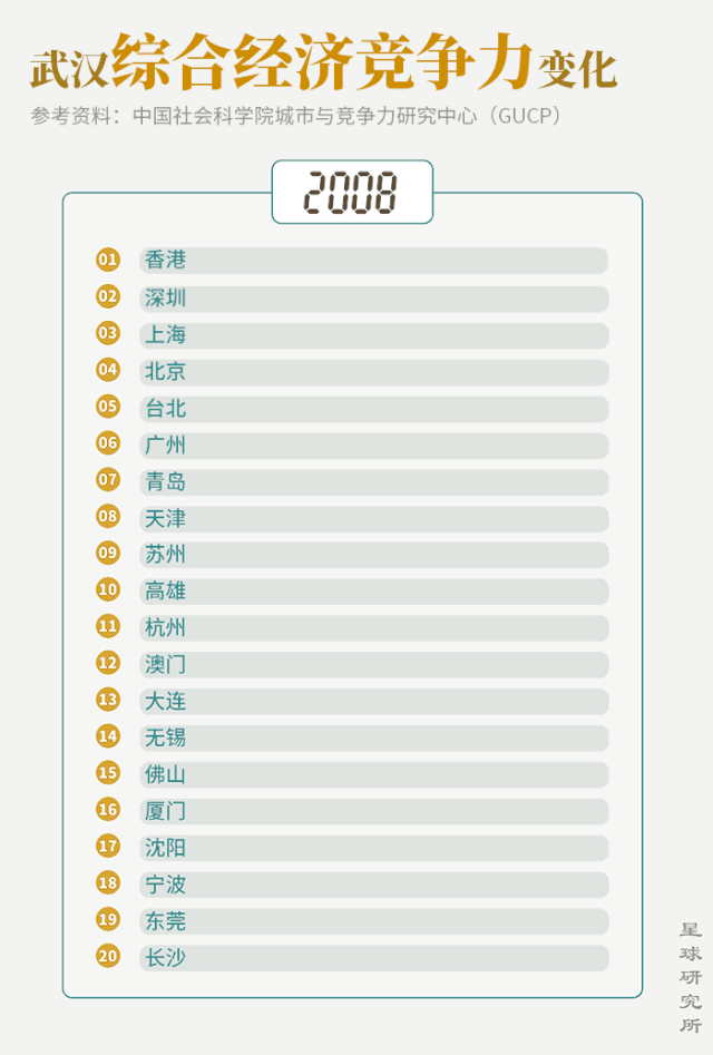 (武汉综合经济竞争力变化,依据中国社会科学院《中国城市竞争力第17次报告》,制图@郑伯容/星球研究所)